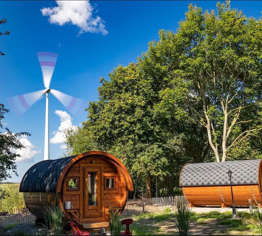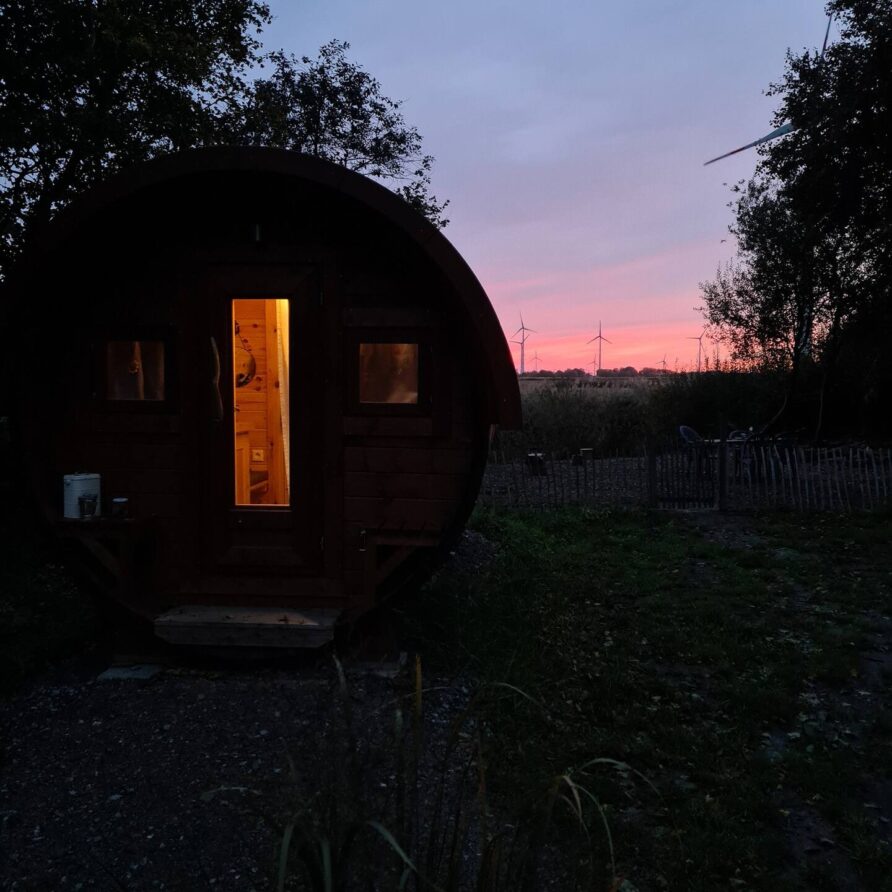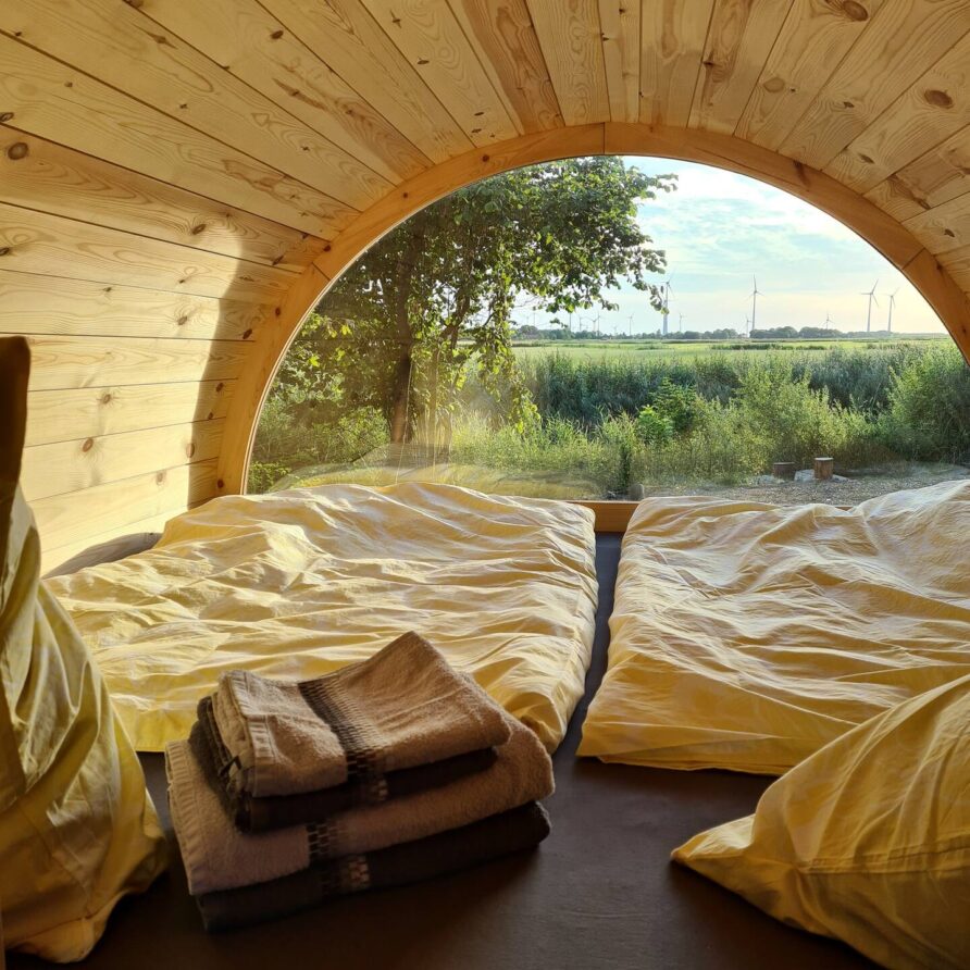 – Gemütliches Holz-Schlaffass mit Blick auf die ostfriesische Landschaft