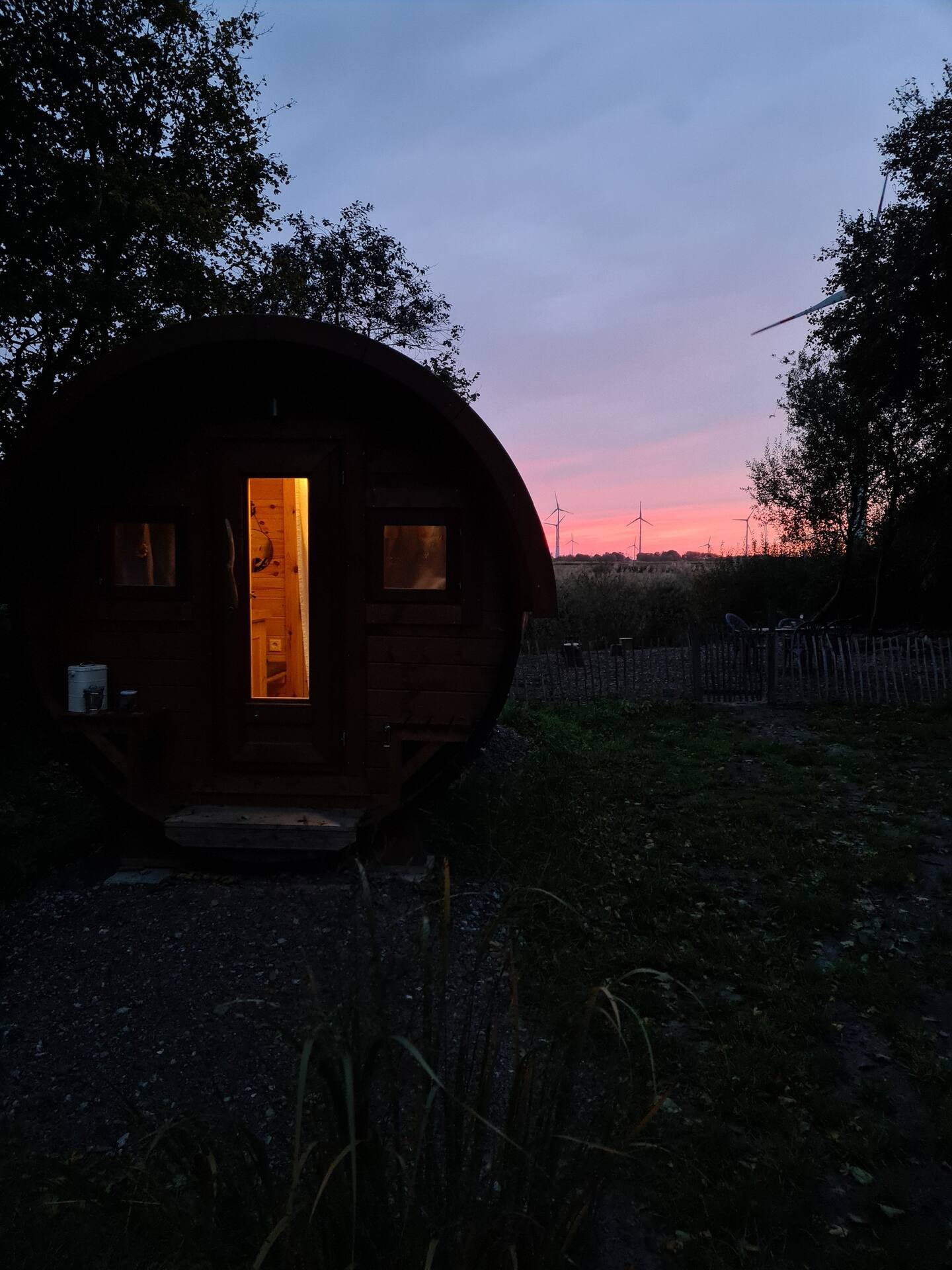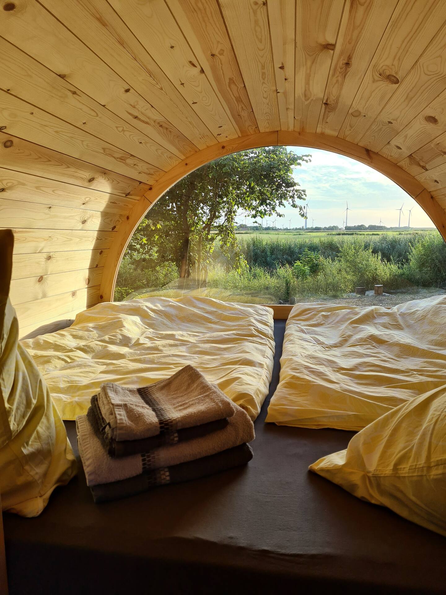 – Gemütliches Holz-Schlaffass mit Blick auf die ostfriesische Landschaft